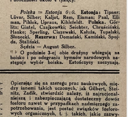 Do sporego skandalu doszło podczas meczu Estonia - Polska 0-0. Niestety spotkanie sędziował miejscowy arbiter August Silber-Sillak, który faworyzował swoich piłkarzy oraz przymykał oko na brutalne faule estońskich piłkarzy. Najpierw nie uznał gola Józefa Kałuży uznając, że piłkarz Cracovii pomagał sobie ręką, a następnie dopuścił do ostrych fauli w wyniku których Kazimierz Seichter i Józef Ciszewski już w pierwszej połowie musieli opuścić boisko. Nasi piłkarze nie chcieli wyjść na drugą połowę i tylko dzięki interwencji Tadeusza Synowca dokończyli zawody. Na zdjęciu widzimy reprezentanta Zygmunta Chruścińskiego z Cracovii, który zagrał z Estonią. Fot. NAC. Kolor. Rafał Jach