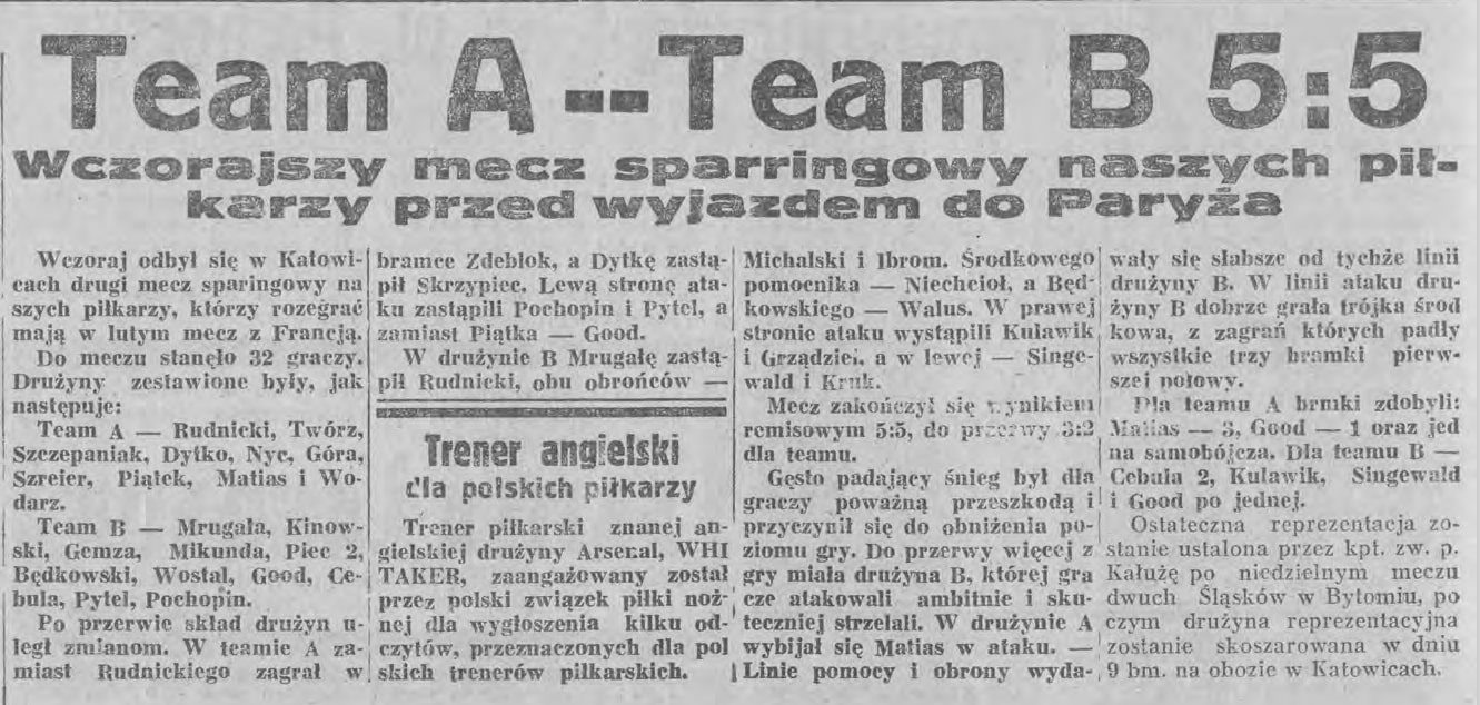 Polska B: Roman Mrugała (AKS Chorzów) (46. Lucjan Rudnicki, Warszawianka) – Edmund Giemsa (Ruch Wielkie Hajduki) (46. Erwin Michalski, Naprzód Lipiny), Alojzy Kinowski (AKS Chorzów) (46. Józef Ibrom, Ruch Wielkie Hajduki) – Jan Bendkowski (AKS Chorzów) (46. Szymon Waluś, Śląsk Świętochłowice), Jerzy Piec II (Naprzód Lipiny) (46. Maksymilian Niechcioł, Śląsk Świętochłowice), Henryk Mikunda (Ruch Wielkie Hajduki) – Jerzy Wostal (AKS Chorzów) (46. Zygmunt Kulawik, Śląsk Świętochłowice), Hubert Gad (Śląsk Świętochłowice) (46. Stanisław Grządziel, Dąb Katowice), Ewald Cebula (Śląsk Świętochłowice), Franciszek Pytel (AKS Chorzów) (46. Werner Singewald, Pogoń Katowice), Alfred Pochopień (AKS Chorzów) (46. Kruk II, Pogoń Katowice). Trener: Józef Kałuża