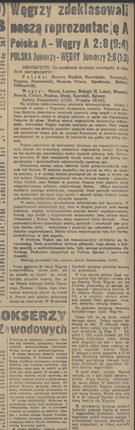 1-0 – Ferenc Deak (14), 2-0 – Bela Egresi (20), 3-0 – Ferenc Puskas (35), 4-0 – Ferenc Deak (45), 5-0 – Mihaly Keszthelyi (49), 6-0 – Ferenc Deak (52), 7-0 – Ferenc Deak (61), 7-1 – Józef Kohut (75), 7-2 – Józef Mamoń (79), 8-2 – Ferenc Puskas (86)