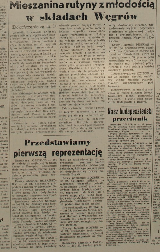 Węgry: Gyula Grosics (Honved Budapeszt, 14/0) – Jenő Buzánszky (Dorogi Banyasz, 6/0), Gyula Lóránt (Honved Budapeszt, 8/0), Jenő Dalnoki (Ferencvaros Budapeszt, 1/0) – Imre Kovács (MTK Budapeszt, 6/0), József Bozsik (Honved Budapeszt, 30/1) – László Budai (Honved Budapeszt, 10/6), Sándor Kocsis (Honved Budapeszt, 20/21), Nándor Hidegkuti (MTK Budapeszt, 19/13), Ferenc Puskas (kapitan, Honved Budapeszt, 37/48), Zoltán Czibor (Vasas Budapeszt, 11/2). Trener: Gusztáv Sebes.