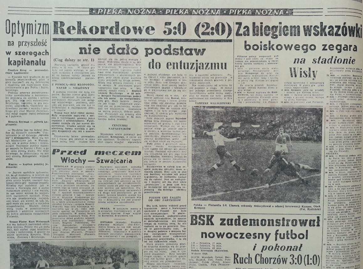 W meczu Polska - Finlandia 5-0 rozegranym na stadionie Wisły Kraków (po ponad 30 latach powrót kadry do Krakowa!) biało-czerwoni zdobyli aż siedem goli, ale sędzia austriacki Franz Grill uznał "tylko" pięć trafień. O ile Krzysztof Baszkiewicz tuż przed końcem meczu rzeczywiście strzelił ze spalonego, to drugi gol Edmunda Kowala (66 minuta) był strzelony prawidłowo. Dodajmy, że nieco wcześniej Polacy również strzelili pięć goli Norwegom. Trener Ryszard Koncewicz wystawił do składu sprawdzonych zawodników jedynie z jednym debiutantem Antonim Konopelskim z Garbarnii Kraków, dla którego był to też ostatni mecz w kadrze. Na zdjęciu w kolorze od lewej stoją: Roman Korynt, Edward Szymkowiak, Henryk Kempny, Henryk Szymborski, Antoni Konopelski, Ernest Pol, Krzysztof Baszkiewicz, Marceli Strzykalski, Jerzy Woźniak, Edmund Kowal, Edmund Zientara. Fot. Archiwum
