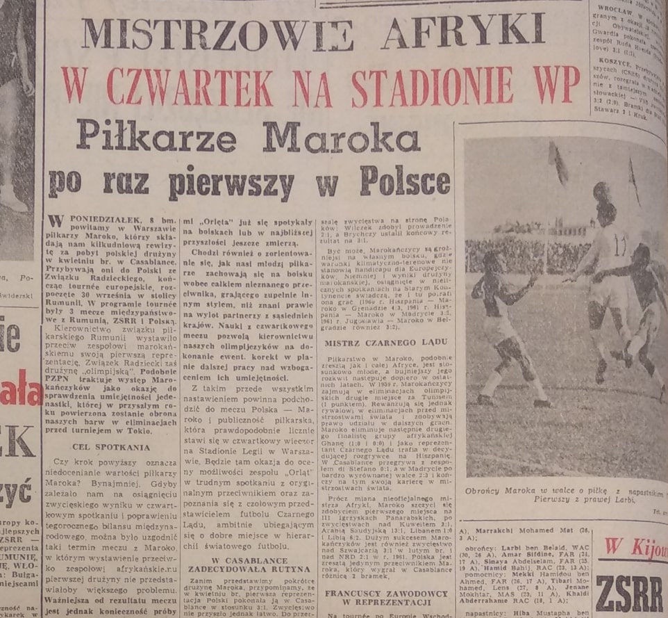 Dzień po mecz Polski z Irlandią Północną 0-2 w el.ME, na Stadionie Wojska Polskiego został rozegrany mecz młodzieżowych reprezentacji Polska U-23 - Maroko U-23. To jedno z wielu kontrowersyjnych spotkań, które niesłusznie zaliczane jest na konto reprezentacji A. Pytanie dlaczego, skoro wystąpiła drużyna olimpijczyków prowadzona przez Tadeusza Forysia. Mecz z uczestnikami igrzysk olimpijskich w 1964 r. zakończył się wynikiem remisowym 1-1. Od prawej stoją: Andrzej Sykta, Henryk Apostel, Jerzy Jóźwiak, Marian Kielec, Jerzy Musiałek, Jacek Gmoch, Piotr Suski, Fryderyk Monica, Joachim Pierzyna, Hubert Kostka, Antoni Nieroba. Fot. Archiwum