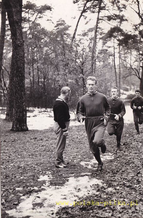 Rok 1962 zaczął się od oficjalnych meczów z Francją i Marokiem. Wcześniej biało-czerwoni rozegrali dwa sparingi. Pierwszy z AZS AWF Warszawa zakończył się zwycięstwem 8-0. Na zdjęciu widzimy piłkarzy w Ośrodku Przygotowań Olimpijskich. Biegi terenowe w Lasku Bielańskim prowadzi Jerzy Woźniak, za nim Ryszard Grzegorczyk. Przygląda się trener kadry Ryszard Koncewicz. Fot. S.K. Wielki Ruch
