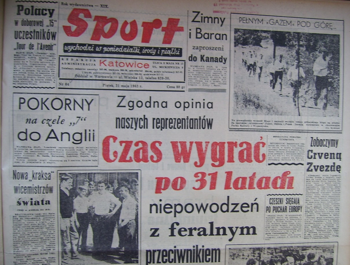 Zwycięskiego składu się nie zmienia, więc biało-czerwoni wystąpili w tym samym zestawieniu, co w spotkaniu z Grecję 4-0. Tyle, że piłkarze przenieśli się z Stadionu Dziesięciolecia na Stadion Śląski. Dwóch piłkarzy Ruchu Chorzów pożegnało się z kadrą, byli to Kazimierz Polok i Roman Kasprzyk. Niestety, Polakom nie udało się przełamać 31-letniej niemocy w potyczkach z Rumunami. Ostatnie zwycięstwo miało miejsce w... 1932 roku! Od tego czasu w 12 spotkaniach wygrywała Rumunia lub padał remis. Także teraz Eugeniusz Faber w końcówce uratował remis. Od lewej stoją: Kazimierz Polok, Józef Gałeczka, Eugeniusz Faber, Roman Bazan, Antoni Nieroba, Jerzy Musiałek, Włodzimierz Śpiewak, Stanisław Oślizło, Bernard Blaut, Konrad Kornek i Lucjan Brychczy. Fot. Archiwum