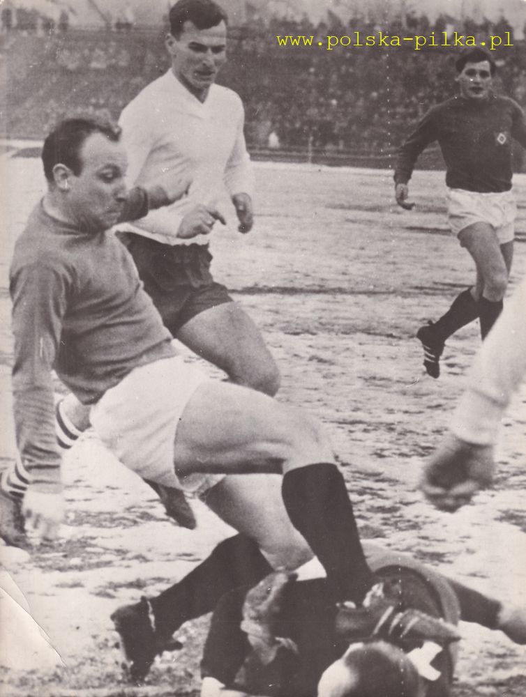 Na początku lutego 1965 r. reprezentacja Polski udała się na zagraniczne tournee do Niemiec i Belgii. 3 lutego rozegrała pierwszy sparing z połączonymi drużynami Hannoveru i Hamburger SV. Mecz zakończył się remisem 2-2. W naszej drużynie pojawiły się nowe twarze, m.in Janusz Kowalik z Cracovii i Jacek Gmoch z Legii Warszawa. Na zdjęciu widzimy słynnego Uwe Seelera, który strzela nad Edwardem Szymkowiakiem. Na środku Stanisław Oślizło i po prawej strzelec dwóch goli Walter Rodekamp. Fot. Archiwum S.K. Wielki Ruch