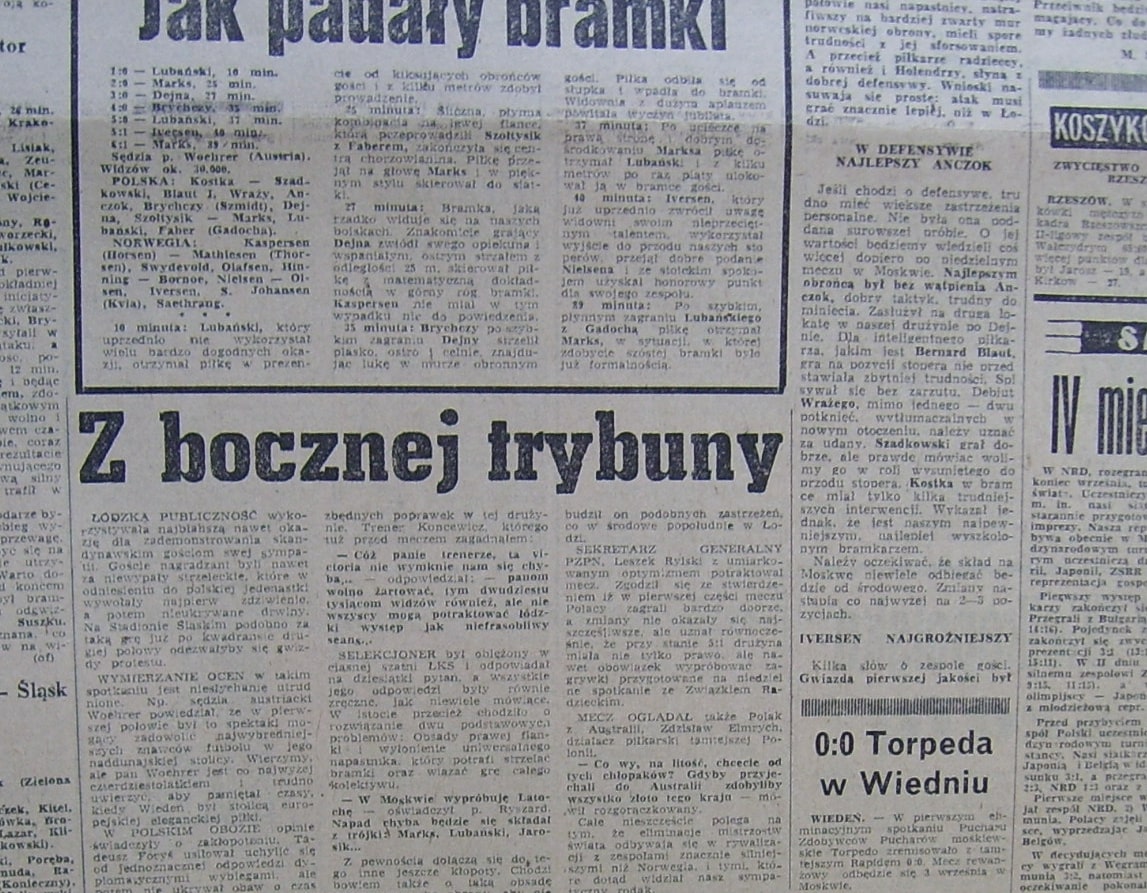 1-0 – Włodzimierz Lubański (10), 2-0 – Joachim Marx (25), 3-0 – Kazimierz Deyna (26), 4-0 – Lucjan Brychczy (35), 5-0 – Włodzimierz Lubański (37), 5-1 – Odd Iversen (40), 6-1 – Joachim Marx (90)