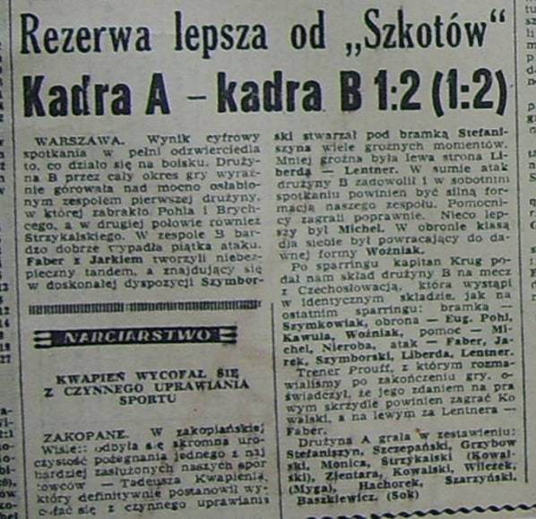 Reprezentacja Polski B tuż po meczu sparingowym przeciwko Polska A 2-1. Ta drużyna dwa dni później rozegrała mecz towarzyski z Czechosłowacją B. W górnym rzędzie od lewej stoją: Antoni Nieroba, Władysław Kawula, Adam Michel, Eugeniusz Pohl, Jerzy Woźniak, Edward Szymkowiak; kucają od lewej: Eugeniusz Faber, Engelbert Jarek, Henryk Szymborski, Jan Liberda i Roman Lentner. Fot. Archiwum