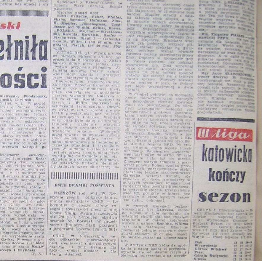 31 października 1965 roku odbył się w Żytawie mecz towarzyski NRD B - Polska B 2-0. Na zdjęciu widzimy pojedynek Stanisława Majchera z Klausem Zinkiem, który zdobył jednego z dwóch goli dla gospodarzy. Od lewej można zobaczyć Władysława Kawulę i po prawej Romana Strzałkowskiego. Fot. S.K. Wielki Ruch