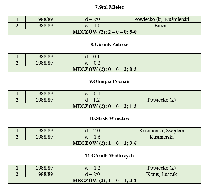 18.09.1988: GKS Jastrzębie – Stal Mielec 2:0 01.10.1988: GKS Jastrzębie – Śląsk Wrocław 2:0 25.03.1989: GKS Jastrzębie – Wisła Kraków 4:2 24.05.1989: GKS Jastrzębie – Górnik Wałbrzych 2:0 |