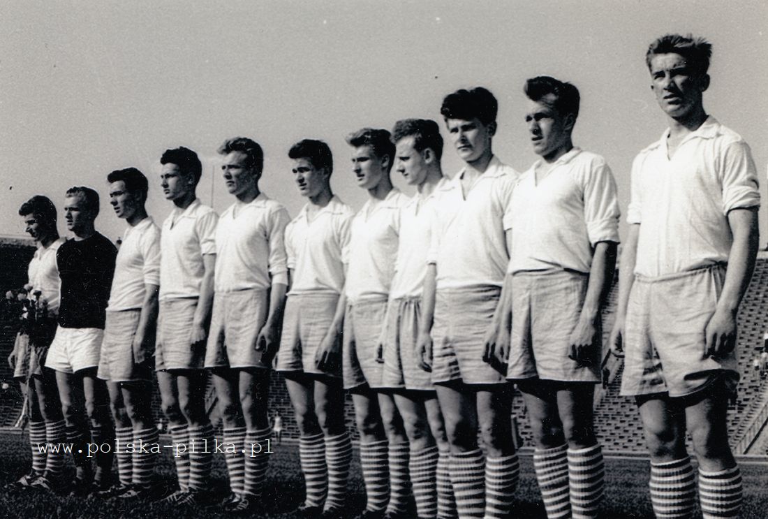 Mecz Polska U-23 - Rumunia U-23 1-1 w 1957 r. z inego ujęcia Ryszard Budka stoi piąty od prawej. Fot. Archiwum Władysława Kawuli (historiawisly.pl)