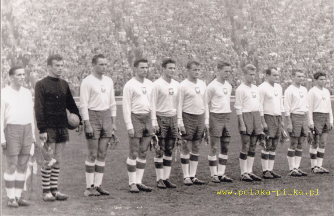 Mecz Polska - Czechosłowacja 1-1 z 1953 r. Gerard Cieślik stoi pierwszy od lewej. Fot. Archiwum