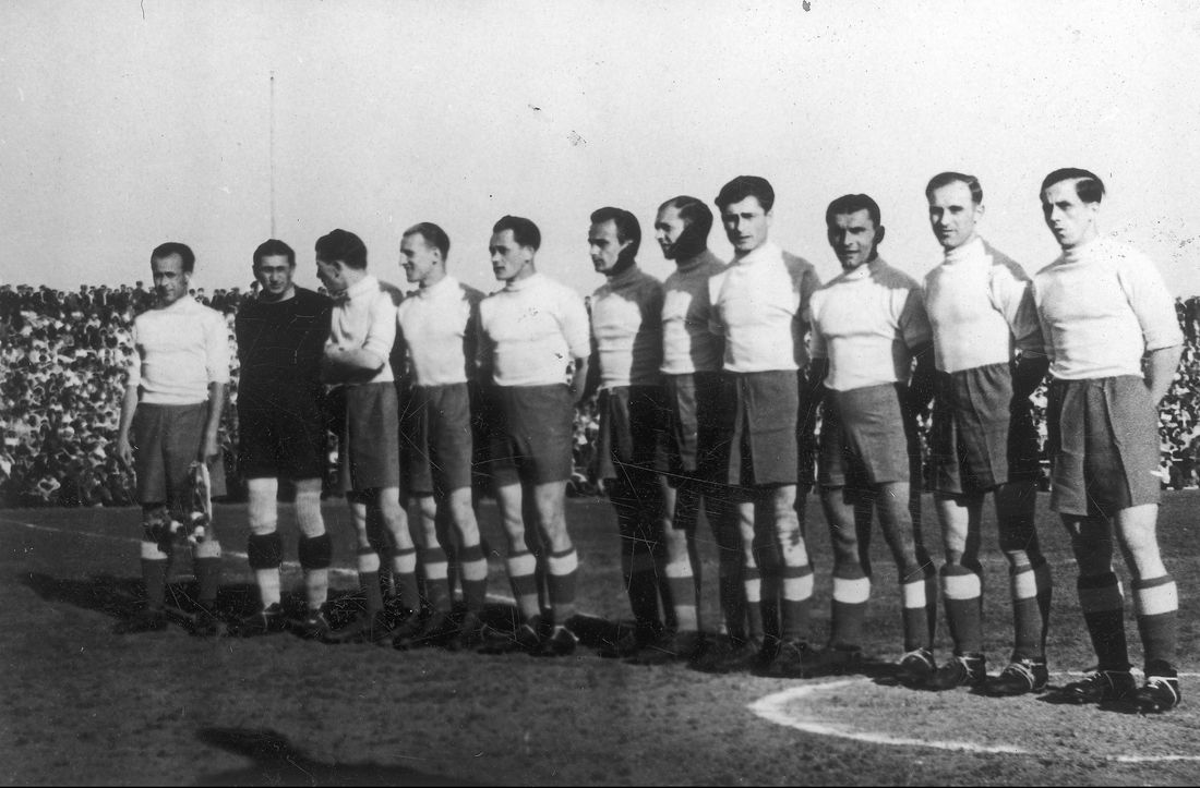 Mecz Polska - Czechosłowacja 0-2 w 1949 roku. Stanisław Flanek stoi czwarty od lewej. Fot. SK Wielki Ruch
