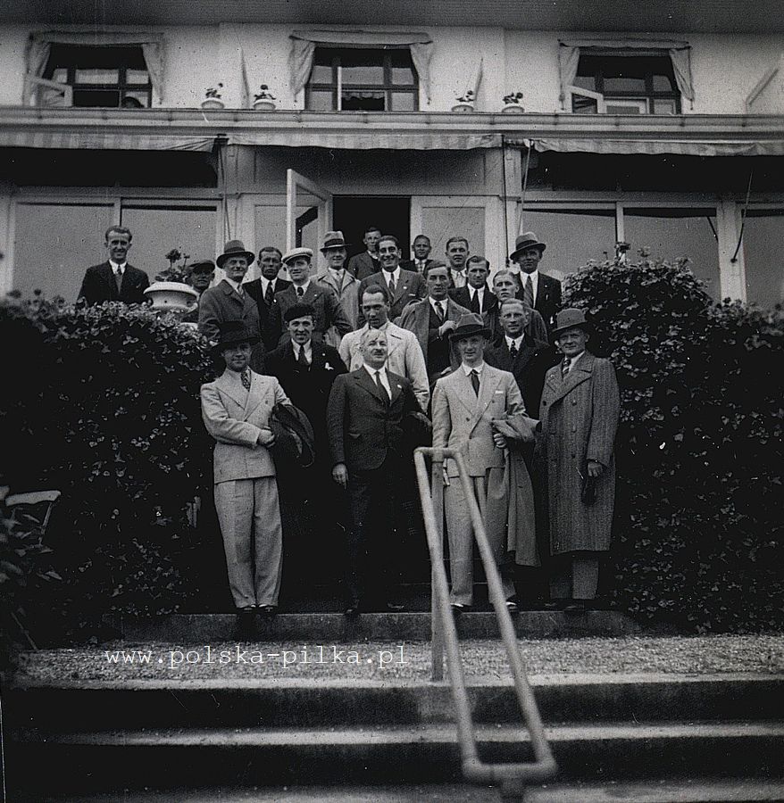 Reprezentanci przed meczem Dania - Polska 4-2 w 1934 r. Jan Pająk stoi pierwszy od prawej (wliczająć piłkarzy, w kapeluszu). Fot. Archiwum Gerarda Wodarza